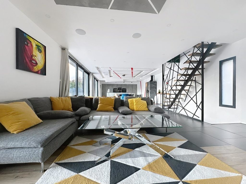 Au 1er étage : une cuisine ouverte sur le salon/séjour d'une surface totale de 80 m², un dégagement, un WC séparé,