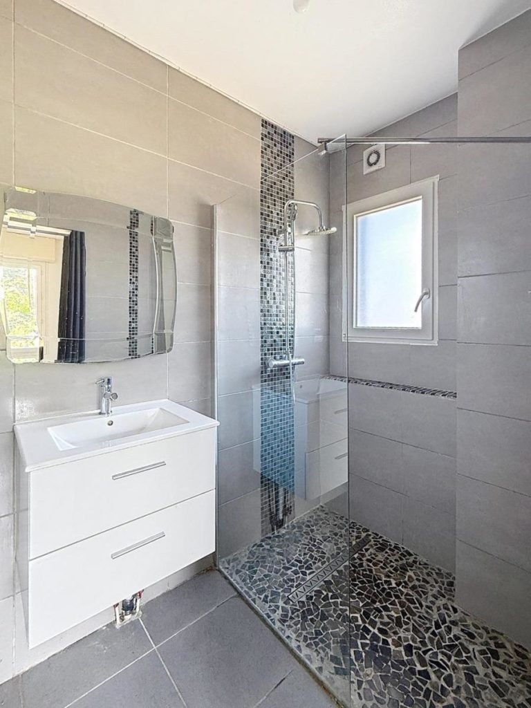 . RDC surélevé : entrée, cuisine ouverte sur séjour-salon (37 m²) accès sur TERRASSE de 32 m² SUD/EST, 1 chambre (12 m²) avec salle d'eau privative, wc.